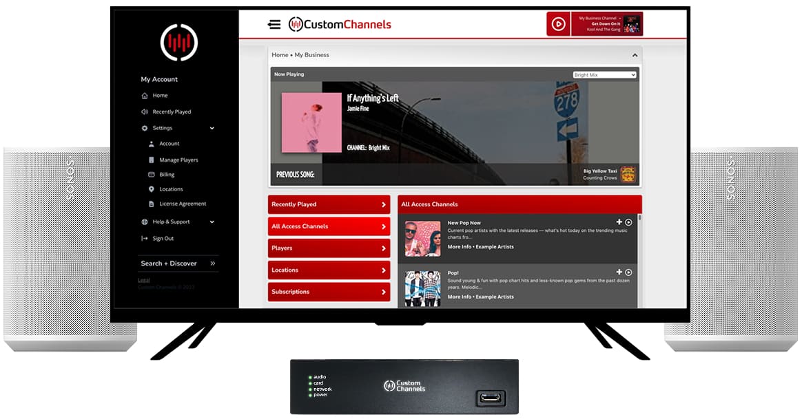 Custom Channels offers a range of playback options to suit the unique needs of your business. Whether you prefer our dedicated hardware player or want to integrate with existing systems like Sonos, Bluesound, or smart TVs, we ensure a seamless and high-quality music streaming experience.